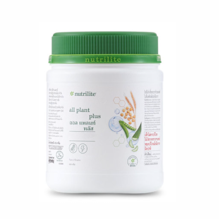 นิวทริไลท์ เครื่องหมายการค้า ออล แพลนท์ โปรตีน พลัส ผลิตภัณฑ์เสริมอาหาร โปรตีนสกัดจากพืช 3 ชนิด ได้แก่ ถั่วเหลือง ข้าวสาลี และถั่วลันเตา ให้กรดอะมิโน 9 ชนิด โปรตีนให้กรดอะมิโนที่จำเป็นต่อการสร้างโปรตีนชนิดต่างๆในร่างกาย และจำเป็นต่อการเจริญเติบโตและช่วยซ่อมแซมส่วนที่สึกหรอของร่างกาย พร้อมดูอัลเปปไทด์และผงอโลเวรา