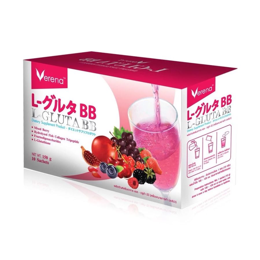 Verena L-Gluta BB 10 Sachets ผลิตภัณฑ์เสริมอาหารด้วยคุณค่าของแอล-กลูต้าไธโอน เกรดพรีเมี่ยม จากประเทศญี่ปุ่นผสานคุณค่าจากคอลลาเจนไตรเปปไทด์ อุดมด้วยสารสกัดเข้มข้นจากมิกซ์เบอรี่ 10 ชนิด